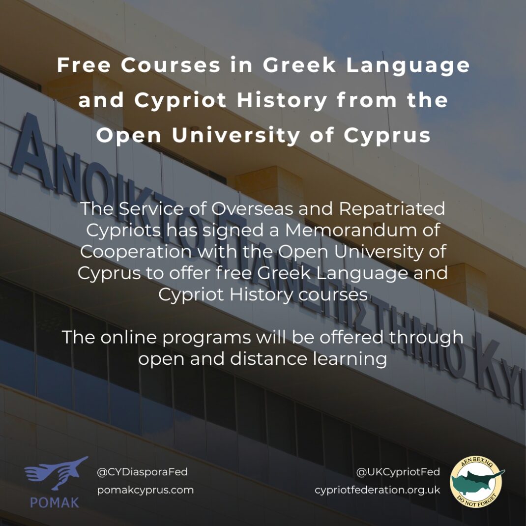 The Open University of Cyprus (Ανοικτό Πανεπιστήμιο Κύπρου), in collaboration with the Service for Overseas and Repatriated Cypriots, is launching a new series of free distance learning courses in Greek Language and Cypriot History. This initiative aims to support members of the Cypriot and broader Hellenic diaspora worldwide, offering accessible and flexible online learning opportunities. More details about the courses, structure, and schedule will be announced soon.
