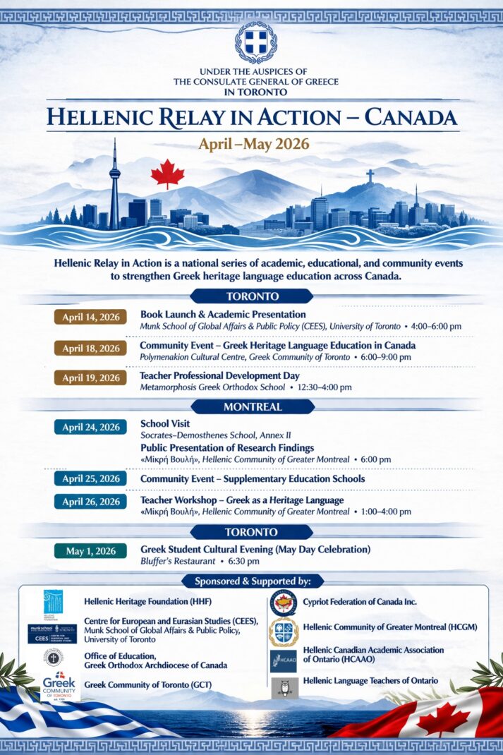 The Hellenic Relay in Action initiative is a national series of academic, educational, and community events taking place across Canada in April and May 2026. Building on the findings of the Hellenic Relay study, funded by the Hellenic Heritage Foundation (HHF), this initiative brings together universities, educators, community organizations, and students with a shared goal to strengthen Greek heritage language education and ensure its sustainability for future generations.